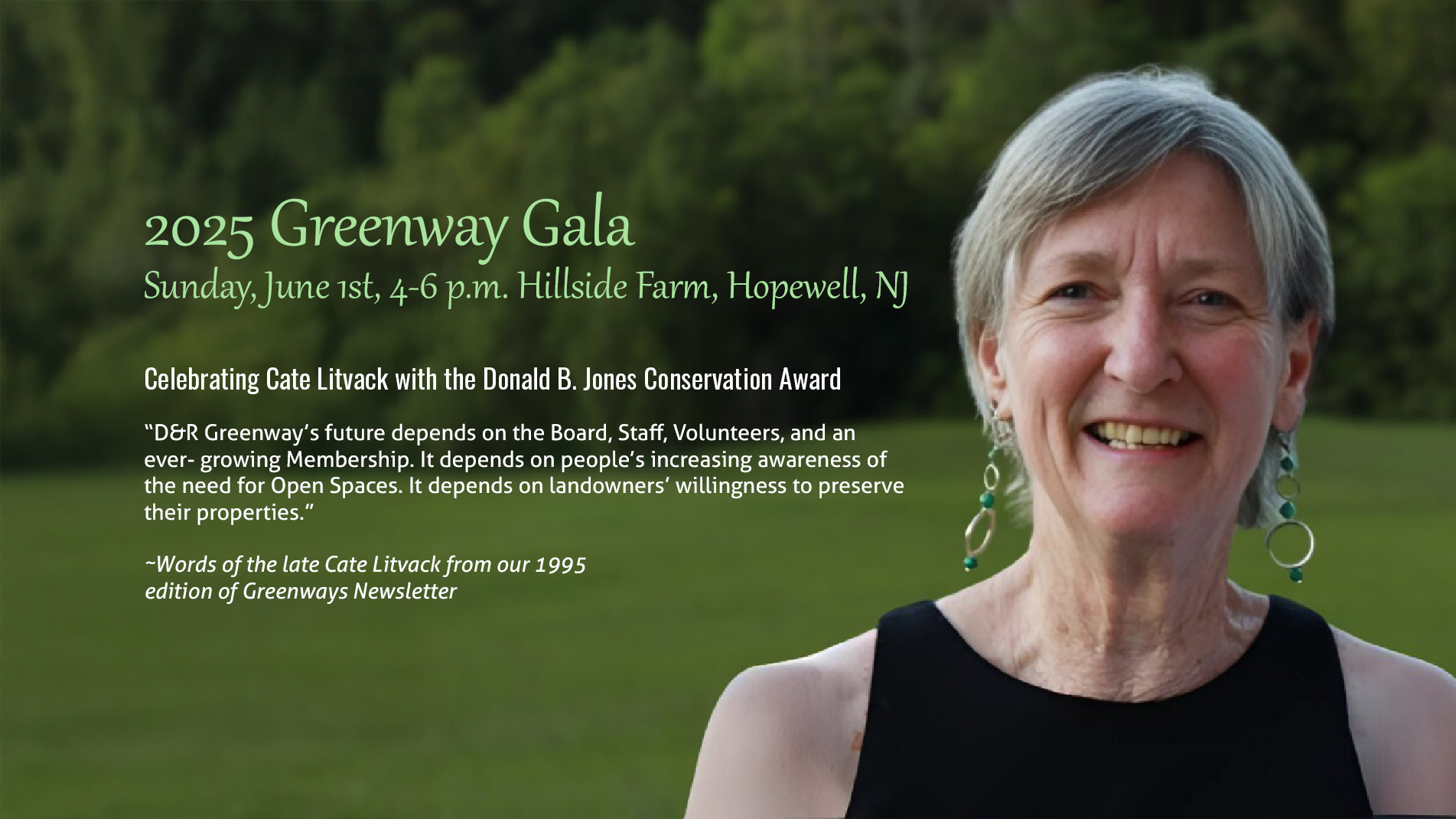 Mark your calendar for Sunday, June 1st from 4:00 – 6:00 pm for our Greenway Gala at Hillside Farm – appropriately on preserved land that served as an encampment during the American Revolution. Please join us as we present our 2025 Donald B. Jones Conservation Award to Cate, posthumously, in recognition of her impactful legacy. Her family will join us to accept the award and celebrate her legacy.